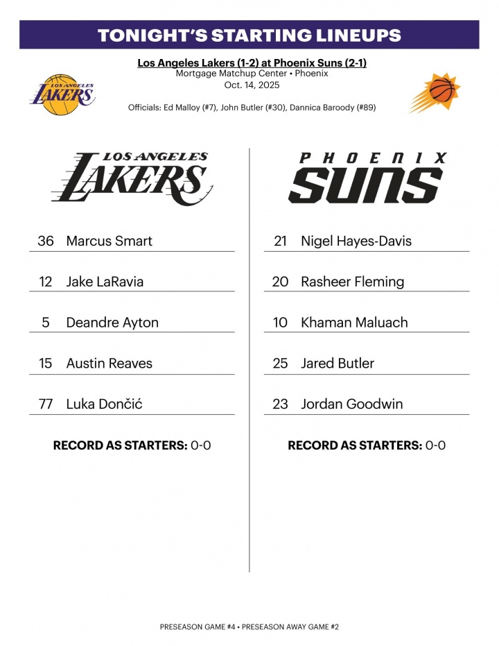 2025-10-15 18:05:07湖人vs太阳先发出炉:东契奇&斯玛特赛季首秀!东艾首次搭档